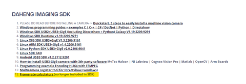To calculate the framerate of an industrial camera, a framerate calculator is available. This doc used to be available after installing the SDK. The frame rate calculator (an excel file) was located in the folder C:\Program Files\Daheng Imaging\GalaxySDK\Doc. Currently you can download the frame rate calculator from our download area.