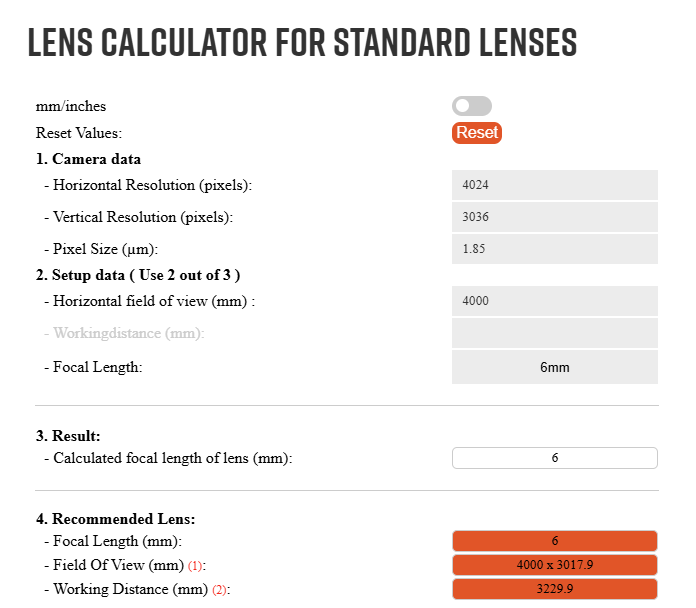 O nosso calculador de lentes indicou que uma distância focal de 6 mm proporcionaria o desempenho desejado. Com base neste cálculo, recomendamos a VA-LCM-12MP-06MM-F2.4-017. Esta lente C-mount de 12 MP e 6 mm proporciona um campo de visão de 4000 x 3017,9 mm a uma distância de trabalho de 3229,9 mm, cobrindo perfeitamente a mesa de corte. É também totalmente compatível com o sensor Sony IMX226 de 1/1.7 polegadas, garantindo imagens nítidas e sem distorção em toda a área.